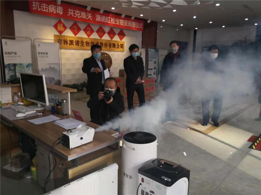 2020年2月2日长春新区北湖开发区党委书记于柏生一行人来到公司总部,领取了公司向社会捐赠的物资——价值二十万元的红松精油消杀系列产品,详单如下:红松植物精油500瓶、红松基多酚手喷空气净化器60套、松林迷雾空气清新喷雾剂30瓶等。红松精油消杀系列产品主要成分为红松多酚精油,经韩国相关专家、科研机构证实,红松精油对冠状病毒拥有很好的消杀功效,能够起到很好的预防作用。